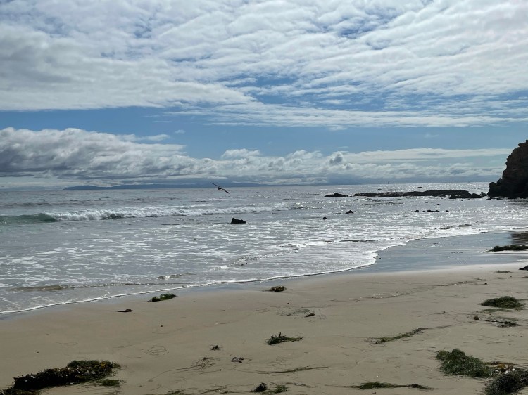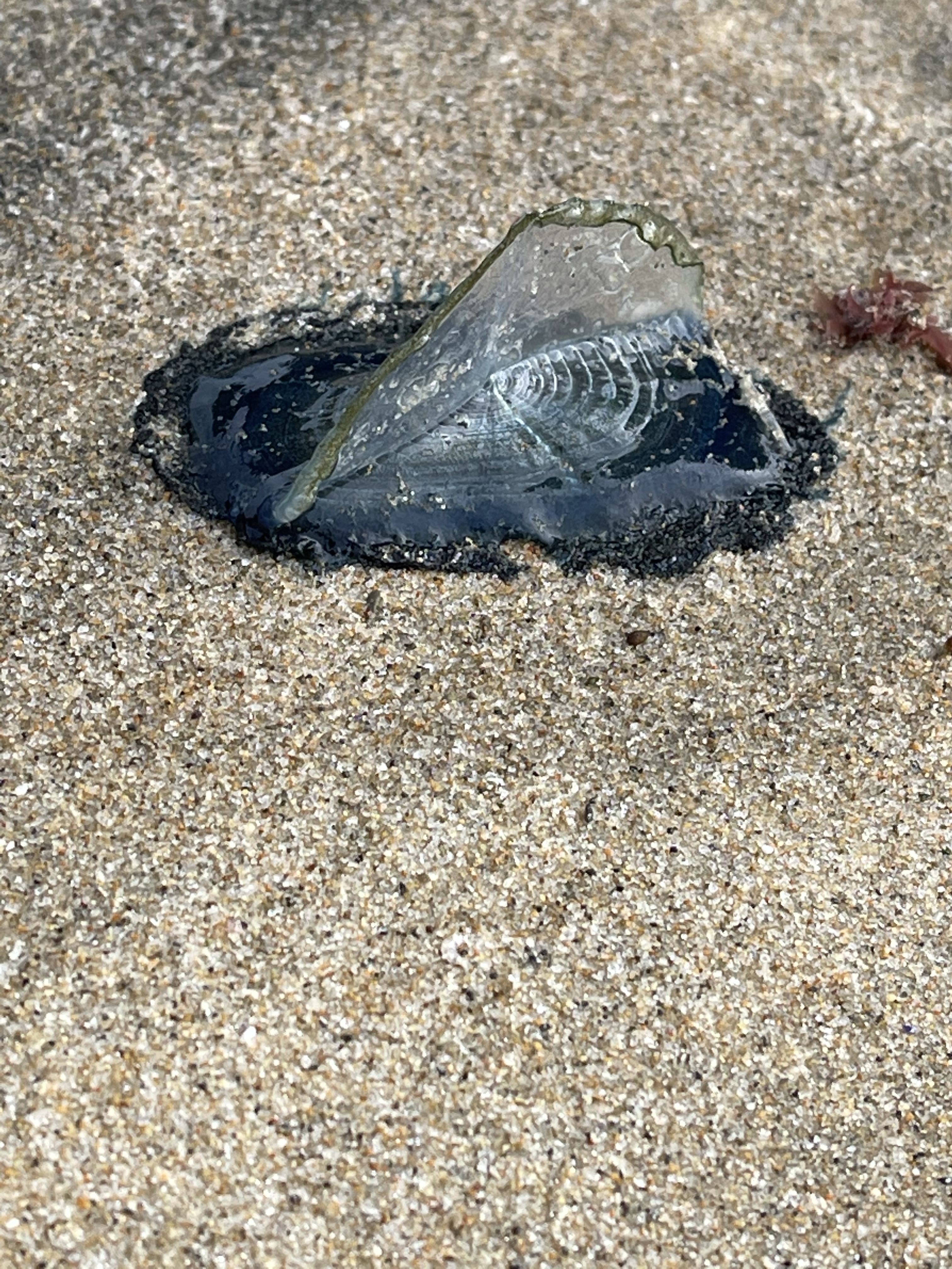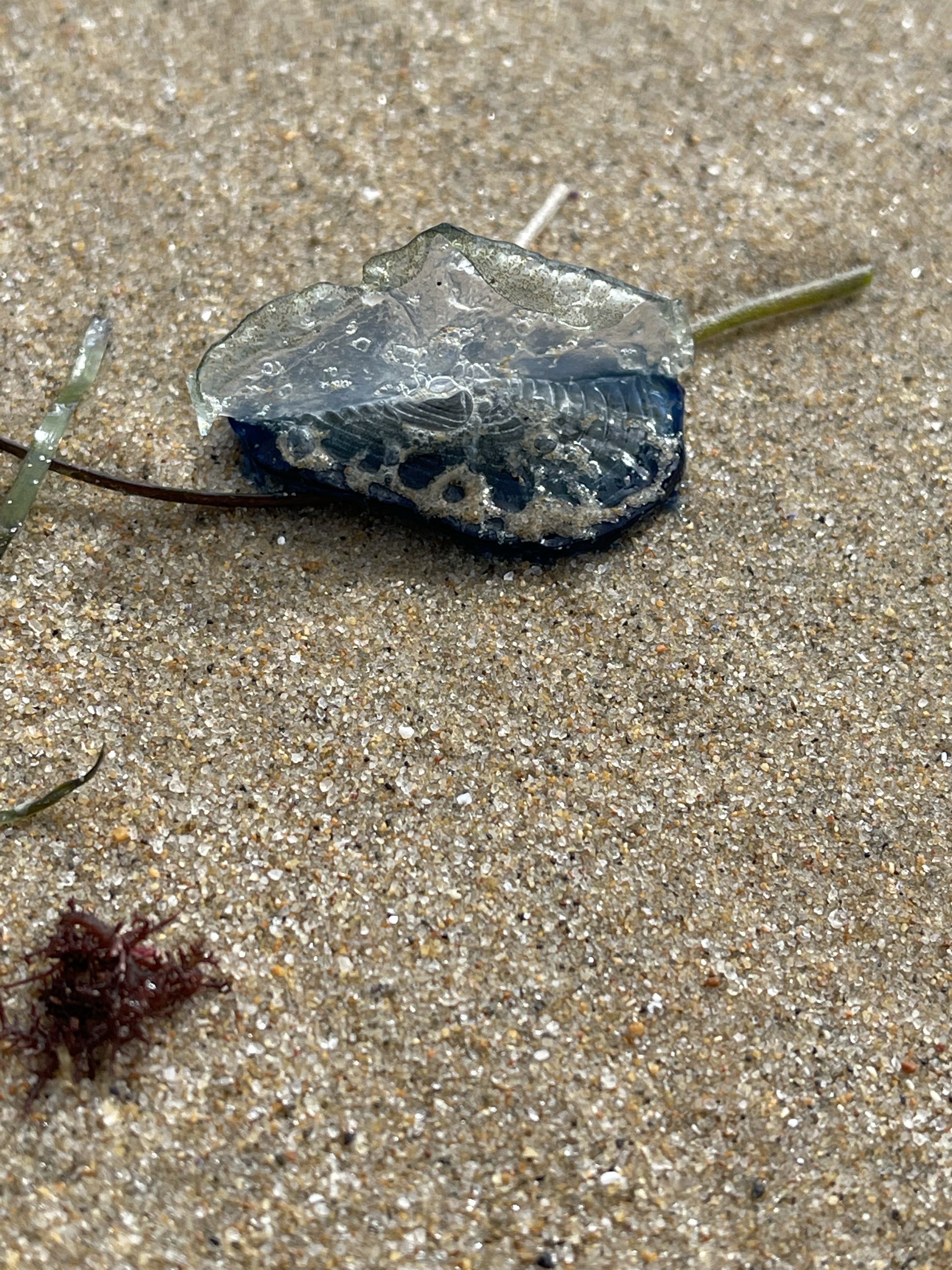 I was missing the usual dolphins and seals during my visit, but was pleasantly surprised by these rare by-the-wind sailors (see photos below) that I found in amongst all the seaweed on the sand. People mistake by-the-wind sailors for Portuguese man o’wars, but the by-the-wind sailors do not have large enough nematocysts to sting humans, whereas I would really avoid touching the man o’wars, even ones washed ashore. (Man o’wars have long strands of nematocysts that can sting, possibly even after being washed up.) Regardless, I was not taking any chances and didn’t touch the by-the-wind sailors, either.