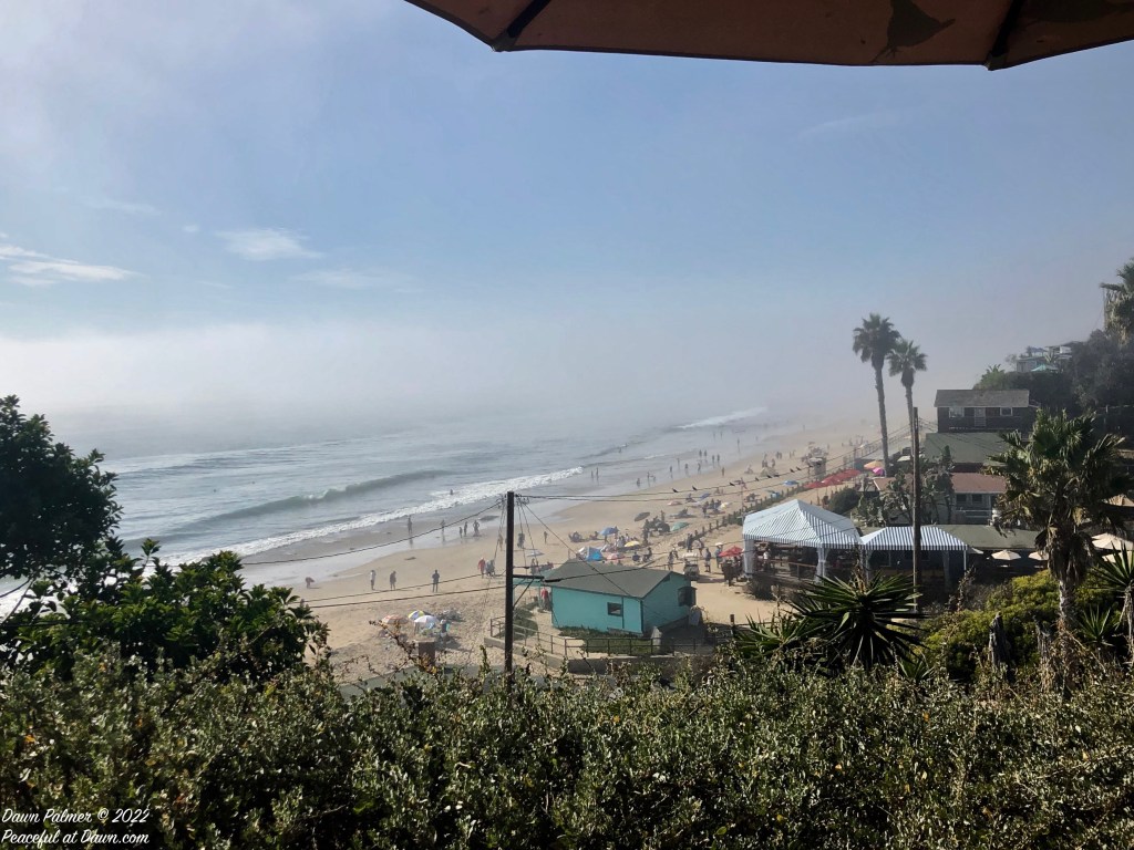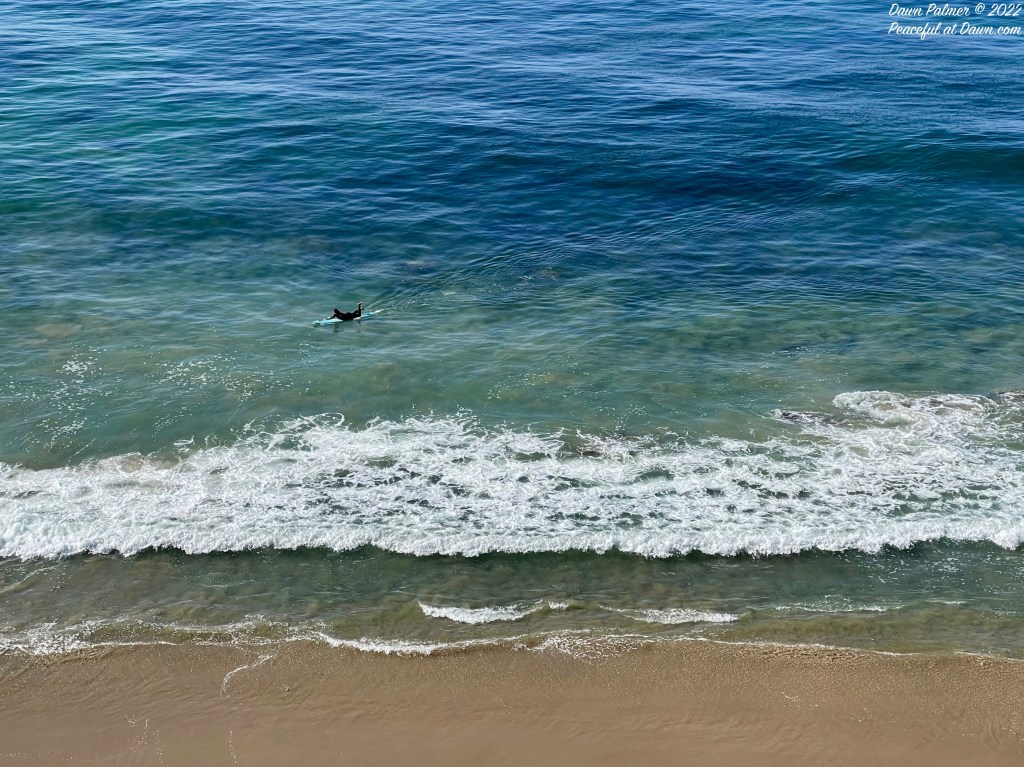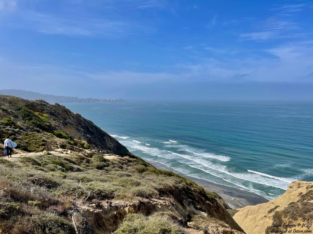 You might notice a difference in colors of the same ocean based on the height from which the photo was taken, as seen in this photo from a Torrey Pines bluff (below). While the beach and ocean are beautiful, I am not as crazy as the surfers hiking down that trail to it–I’ll get my photos from the bluff instead!