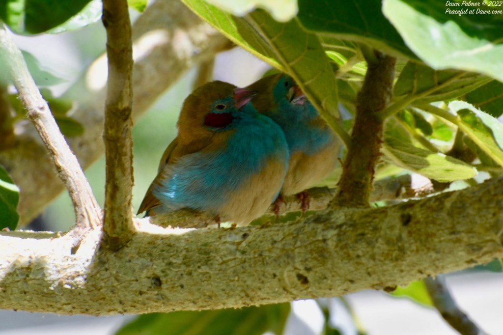 Here is another example of using the shadows of a plant to help with taking bird photos on a sunny day. This cute little couple was found snuggling under leaves at the Africa bird aviary at the San Diego Zoo. I tried to take the birds’ photos when they were out in the sun, but I could not get as much details. Thankfully, they flew under this leaf right in front of me. In the shadows, you can see all of the Red-Cheeked Cordon-Bleu birds’ colors and some detailing in the feathers. The male is on the left with the brighter red cheeks.