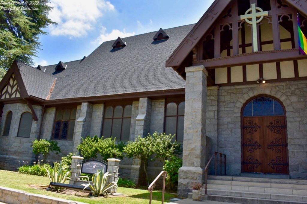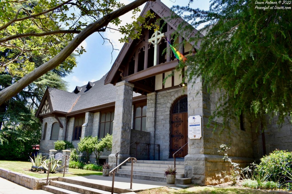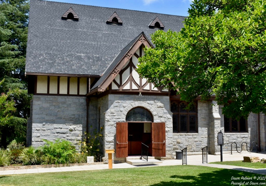 For this week’s Thursday Doors, I am sharing recent photos I took of a neighborhood church. I probably mentioned this before, but we have a lot of really old buildings in my town (well, old for southern California). I am sure I have passed this church many times in the last thirty years, but since I don’t attend it, I never noticed how old it was–not until my friend asked me to take photos and videos of the outside for her husband’s garden memorial. The grounds are not huge, but the doors and architecture are ornate, reminding me of European buildings. This is an episcopal church, with roots from the Church of England, which might explain some of the similarities. I found a stone near one of the doors with a date of June 6, 1887, but this is just when the congregation got started as a mission in another part of the town. As the congregation grew, the church moved a few times and built this large stone structure in 1904, after Mrs. Albert Burrage donated the land (side note – the Burrages have an enormous mansion near my house, and when I get a chance, I will take photos and share that equally impressive building).