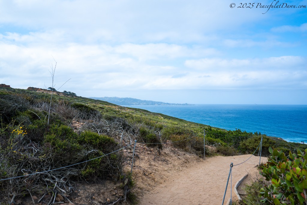 There are a lot of trails on top of Torrey Pines bluffs. Some wander down to the cliff overlooking the ocean, providing an expansive view up and down the coast.